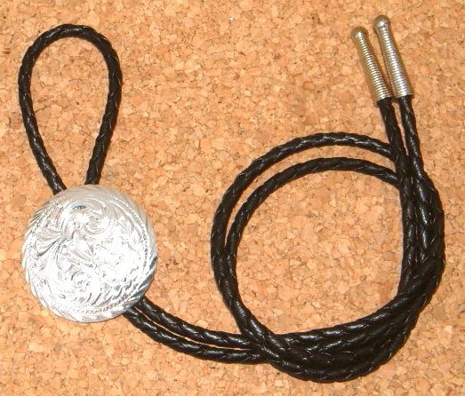 モデルは≪4つ編みレザーロープ仕様 ジャーマンシルバー製 エングレーブ トップ付き ボロタイ(ポーラータイ)≫、