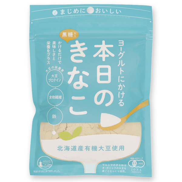 北海道の大地で大切に育てられたオーガニック大豆を、尾道のきな粉工房で皮ごとまるごと焙煎した「全粒きな粉」を使用。