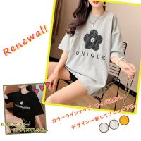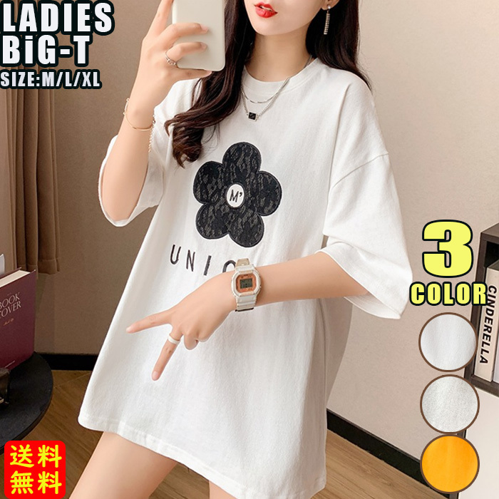 Tシャツ レディース 半袖 トップス 夏 春 カットソー 花 フラワー 刺繍 白 ホワイト グレー イエロー カジュアル