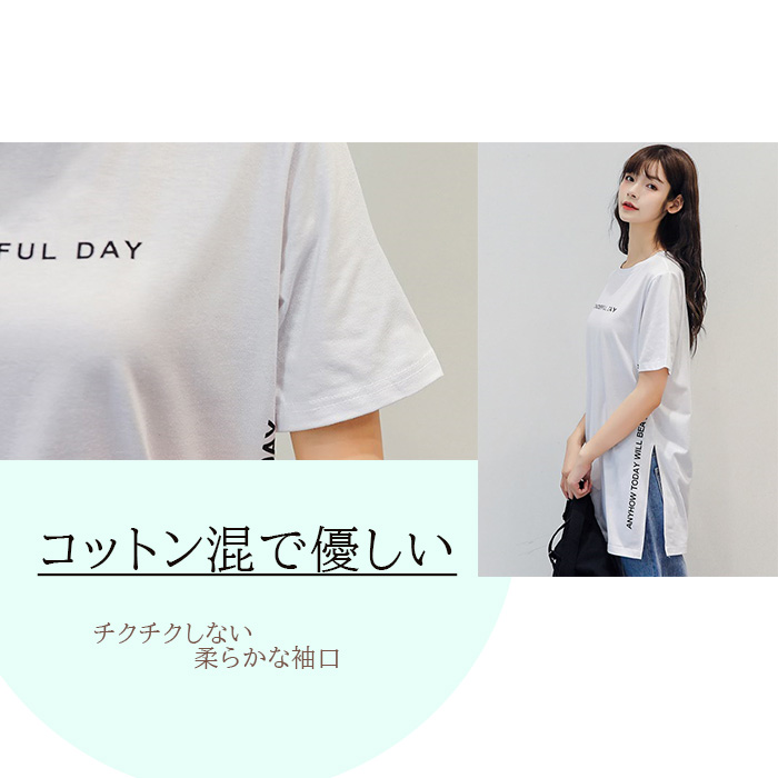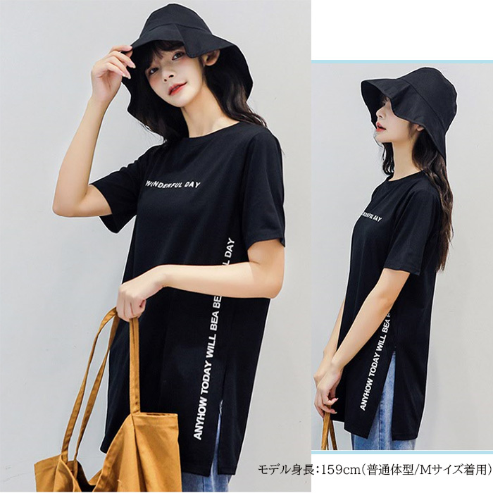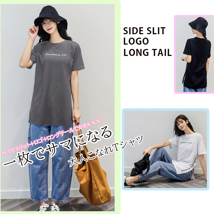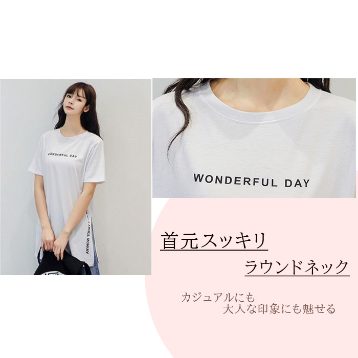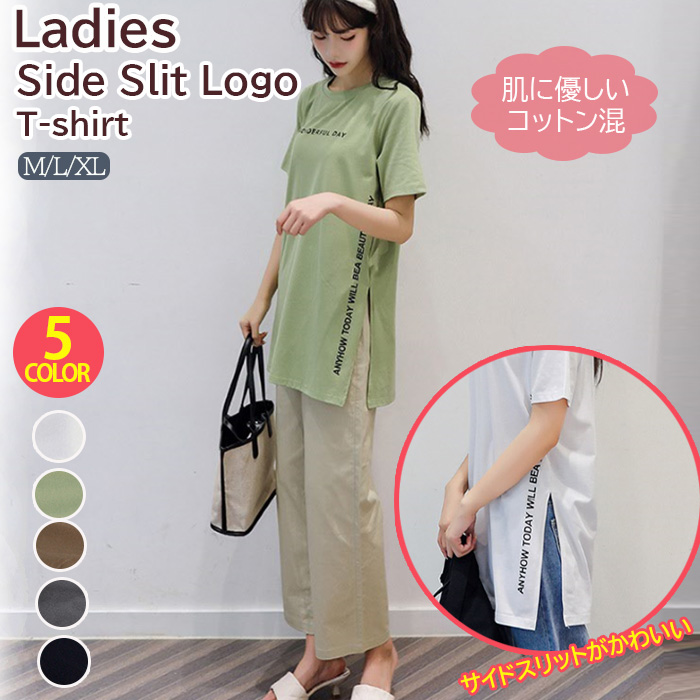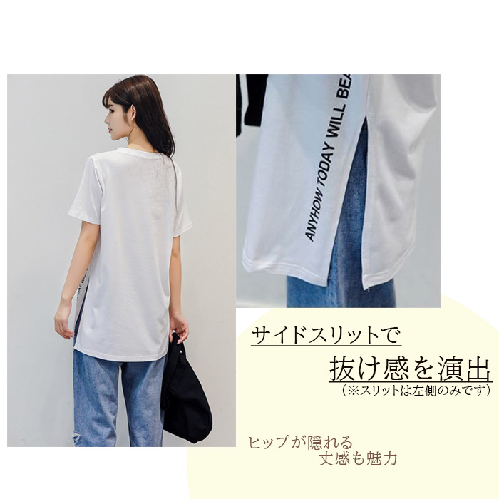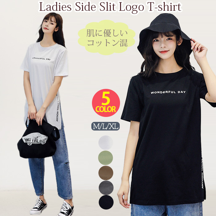 半袖 Tシャツ レディース トップス かわいい 夏 春 チュニック ロング きれいめ サイドスリット ロゴ 20代 30代 40代 50代