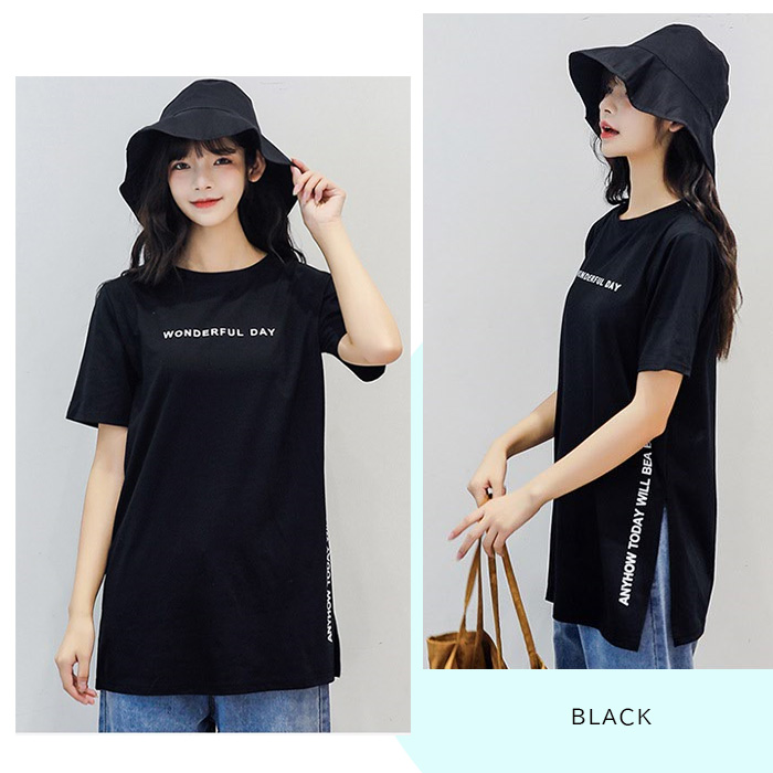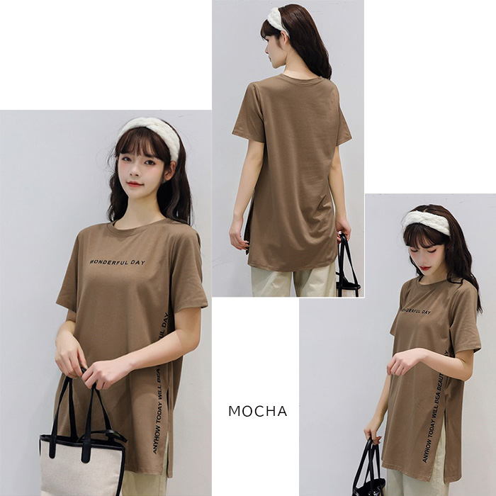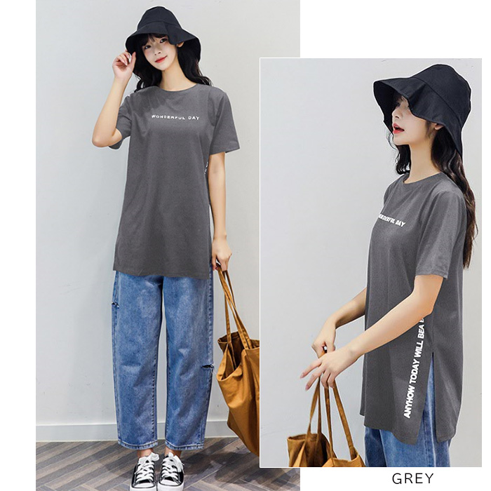 トップス/カジュアル/体系カバー/カットソー/ビッグサイズ/プリントtシャツ ゆるT 綿混 ルーズシルエット 通勤 通学 お出掛け プチプラ M L XLブラック 黒 ホワイト 白 グレー 灰色 茶色 ブラウン グリーン 緑 モカ 抜け感 サイドスリット