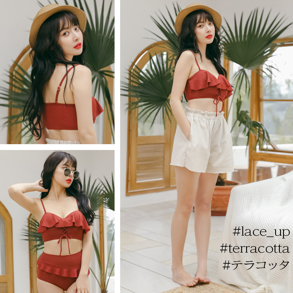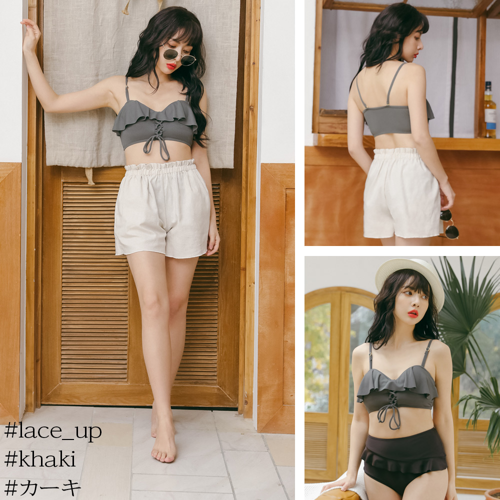 ◇一見フェミニンな胸元レースアップやフリルとカジュアルなショートパンツとのバランスが絶妙にオシャレ感アップ!