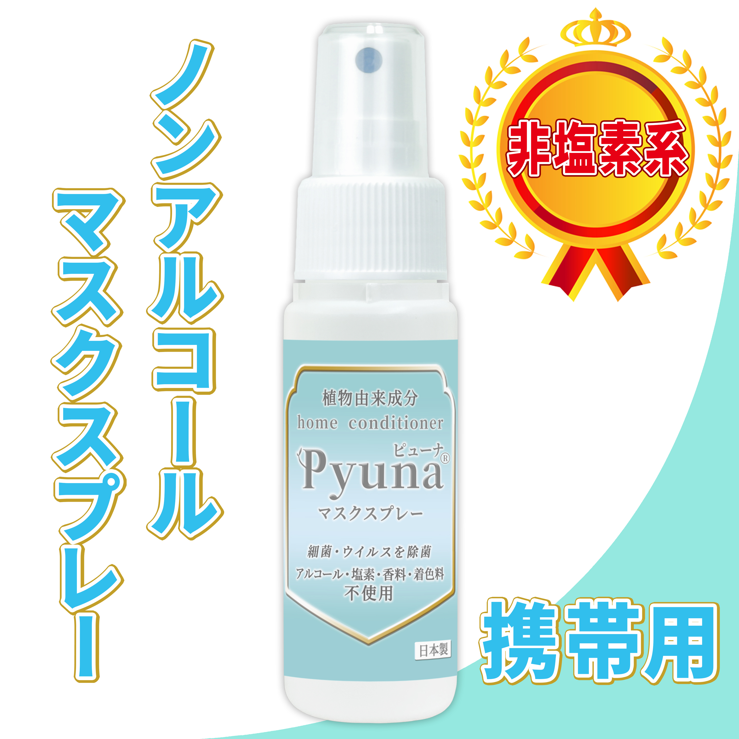 ピューナ除菌剤のページに移動する。■商品説明・非塩素系でノンアルコールのマスク用 除菌スプレーです。植物から抽出したフィトンチッドを微粒子化技術と純水から作った電解イオン水で小型化し細菌・ウイルスに吸着できるようにしました。