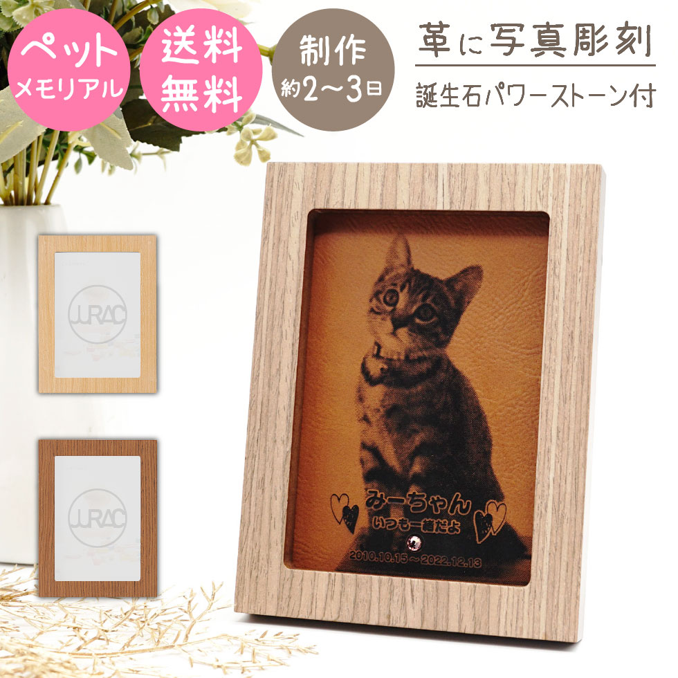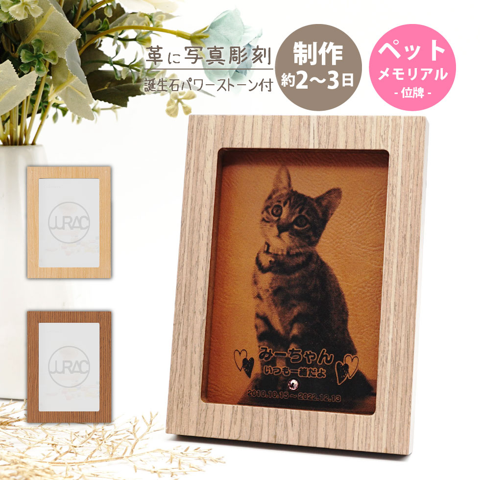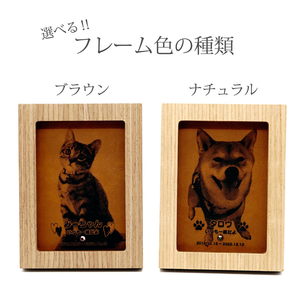 フォトフレームタイプのかわいいペットメモリアル・お位牌です。写真やお名前を革面に彫刻して、世界で1つのお位牌をお作りいただけます。