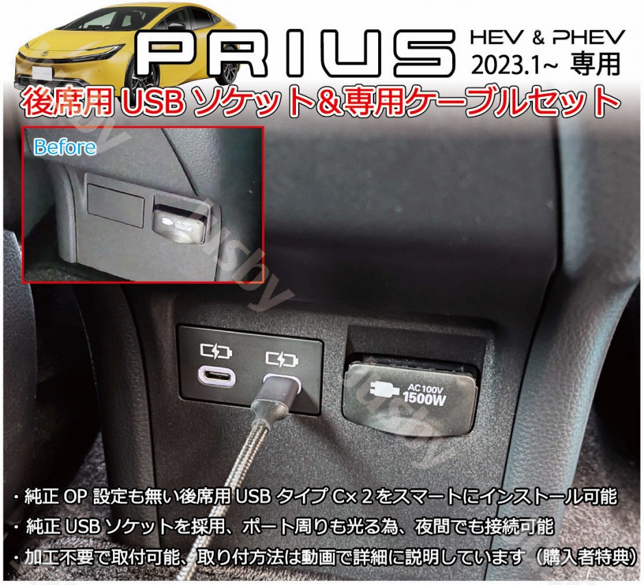 プリウス 60系 後部座席用USBソケット (トヨタ純正)&ケーブルSET 後席USB タイプC 純正ソケット採用 リヤシート用 USB追加アダプタ カーパーツ アクセサリー