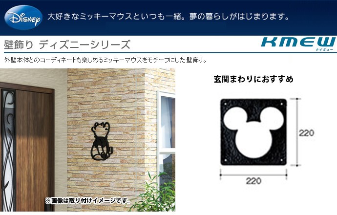 ・商品説明 外壁本体とのコーディネ-トも楽しめるミッキーマウスを モチーフにした壁飾り。大好きなミッキーマウスといつも 一緒で夢の暮らしが始まります。 外壁が透けて見え、その色とのコントラストで印象も変化。 歴史の趣を感じさせる鋳物調の落ち着いた質感です。 新築・リフォームなどにお役立て下さい。