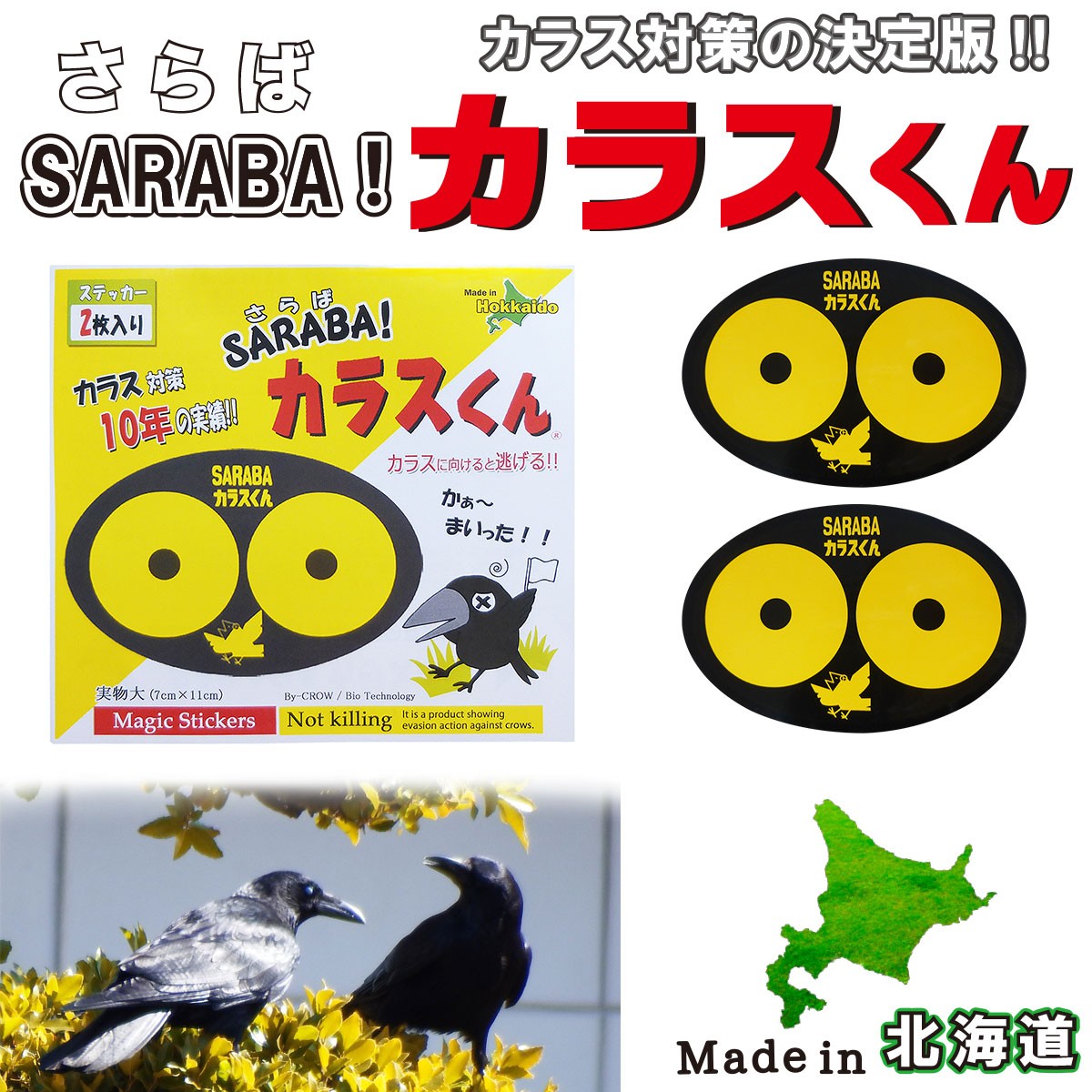 カラス 撃退 よけ 対策 グッズ 駆除 車 ゴミ箱 ボックス ベランダ ネット 建物に SARABAカラスくん ステッカー 2枚入り【SARABAカラスくん正規販売店】