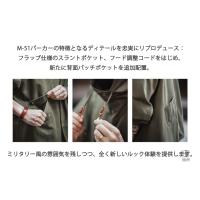 M-51パーカーの特徴となるディテールを忠実にリプロデュース:フラップ仕様のスラントポケット、フード調整コードをはじめ、新たに背面パッチポケットを追加配置。