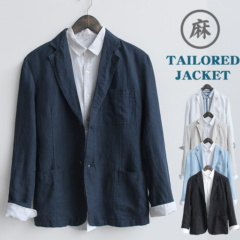 メンズ リネンジャケット 2ボタン 無地 シングル テーラードジャケット ブレザー シンプル ビジネス カジュアル 100%麻 通気 通勤 春 夏 秋服