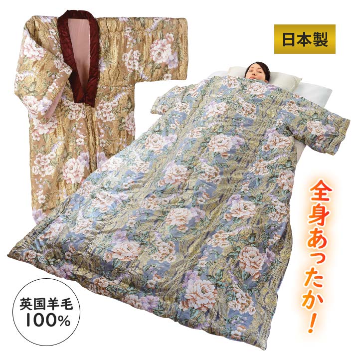 寝具 着る布団 かいまき布団 掛け布団 掛けふとん 羊毛 ウール100% 綿 コットン 暖か 冷え対策 弾力性 耐久性 花柄 日本製 英国羊毛かいまき(メーカー直送)