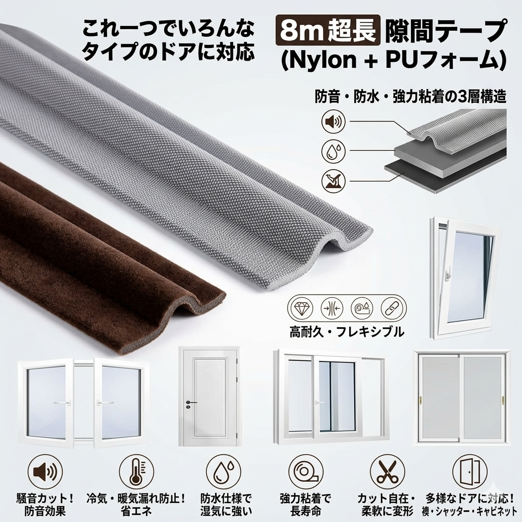 隙間テープ(長さ8m、幅30mm)はナイロン(PE)とPUフォームから作られており、