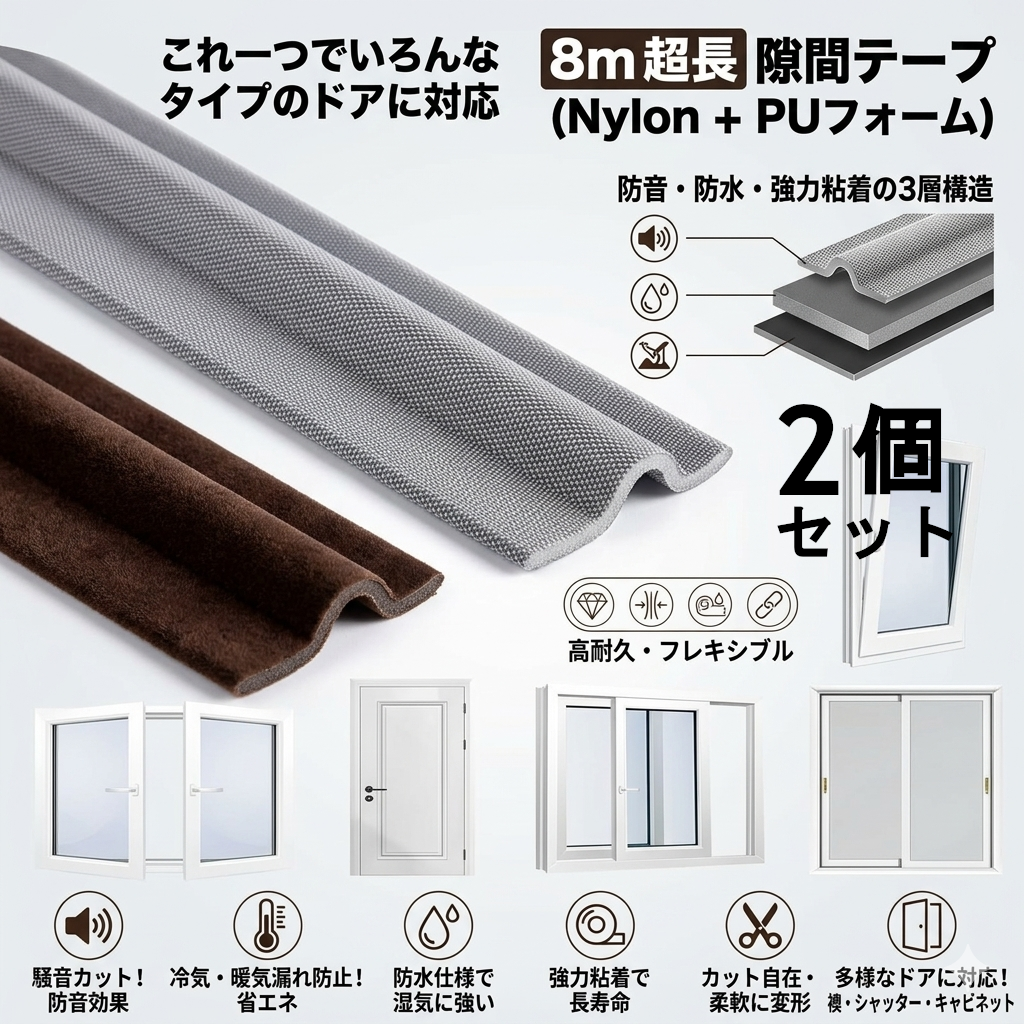 【2個セット】隙間テープ 窓 サッシ 隙間 すきま すき間 テープ 防水 玄関 防音 ドア 引き戸ドア下 風 すきまテープ 2mm 隙間 風 防止 対策 騒音 グッズ サッシ