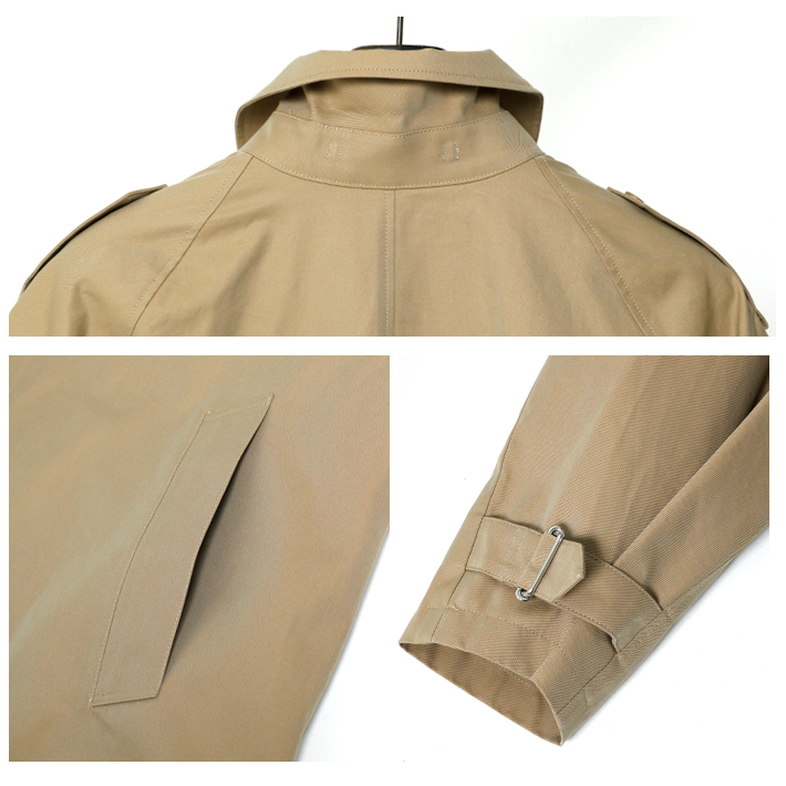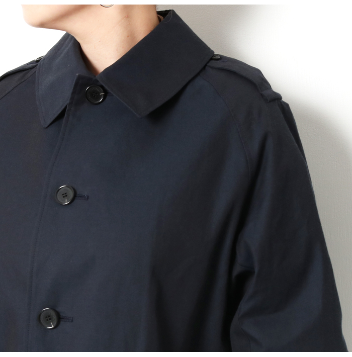 肩周りをコンパクトに見せるラグランスリーブ、特徴的な丸みのある衿、袖口を絞ってブラウジングできるスリーブタブがデザインポイントです。