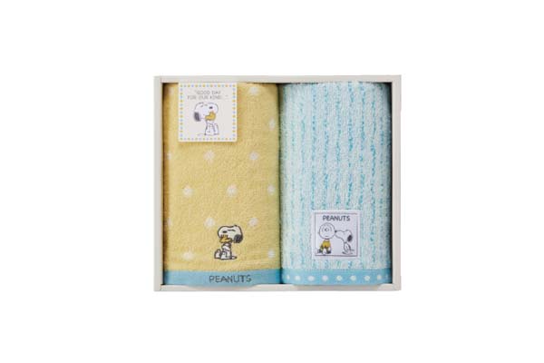 PEANUTSからハグをテーマに、スヌーピーが仲間に寄り添うシーンをモチーフにしました。 ハグするスヌーピーから優しさや思いやりが伝わるデザインです。 ドットとストライプのシンプルなパターンは子どもから大人まで使いやすく、内祝いにおすすめです。