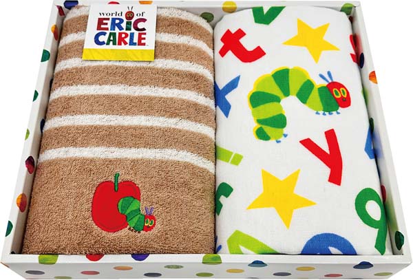 大胆な色使いで大人から子供まで幅広く愛されている絵本「はらぺこあおむし」の、鮮やかな色使いのタオルセットです。