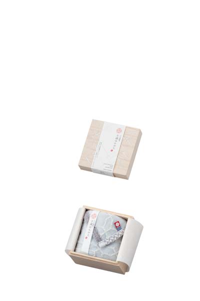 古来からの「模様刺し」のモチーフをあしらった、今治謹製の木箱入りハンカチタオル。木箱には銀の箔押し入りで、ぜいたくな印象のパッケージです。