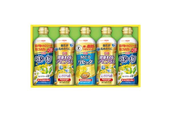 日清MCTリセッタ350g×1、日清健康オイルアマニプラス350g×2(機能性表示食品:届出番号A82、届出表示:本品は、α-リノレン酸を含んでおり、血圧が高めの方に適した機能を持つ食用油です。)、日清ヘルシーオフ350g×2
