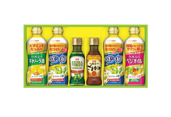 日清エキストラバージンオリーブオイルをはじめバラエティ豊かなヘルシーオイルを詰め合わせたギフトです。