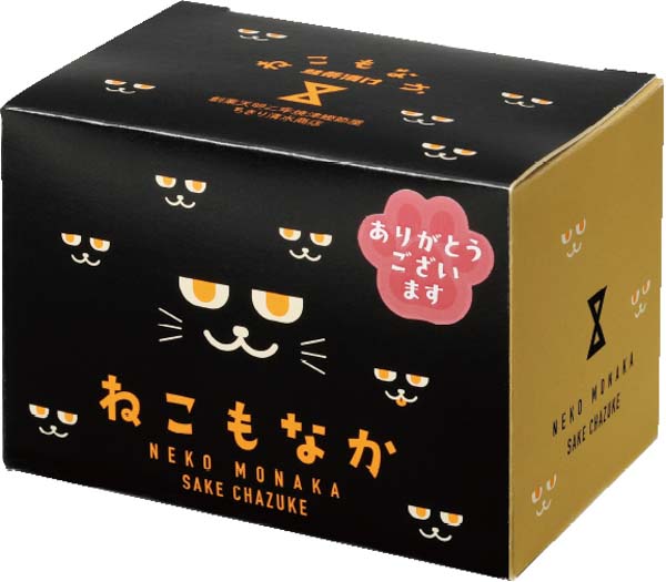 かわいらしい猫のかたちのもなかで、茶漬けを包みました。「ありがとうございます」のメッセージを添えて贈るプチギフトです。