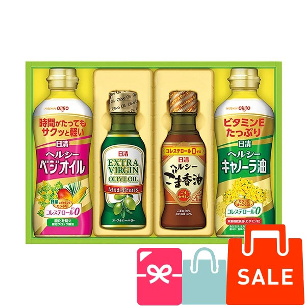 ●日清へルシーキャノーラ油350g×1、日清ヘルシーべジオイル350g×1、日清エキストラバージンオリーブオイル145g×1、日清ヘルシーごま香油145g×1