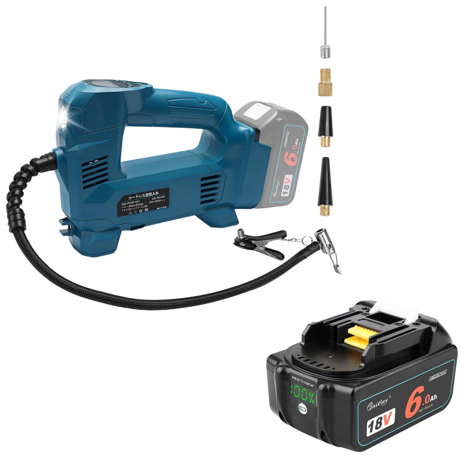 ★Waitley 電動空気入れ+マキタ 18V バッテリー セット。コード不要のポータブル設計:コードを必要としないリチウム電源設計で、どこでも使用できる便利さを提供します。電源の心配なく、車のタイヤを簡単に空気で満たすことができます。旅行や緊急時に非常に便利です。