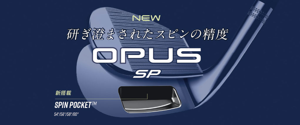OPUSウェッジの登場からわずか1年足らずで、さらに進化を遂げたウェッジがラインアップに加わります。開発者が追求し続けてきた重要指標 Spin Per degree(スピン/打ち出し角)の2つの頭文字を名前に取り入れた、「OPUS SPウェッジ」です。フェースには新開発の17Vグルーブを狭いピッチで配置し、ソール内部にはキャロウェイ独自の革新的な内部構造であるSPIN POCKET(スピンポケット)を搭載。このSPIN POCKETによって重心設計が最適化され、強烈なスピンと狙い通りの低弾道を実現します。さらに、従来のマイクロフィーチャーに代わって、網目状の粗さを生み出すディープフェーサーレーザーを初採用。スピン性能と止まる力を、これまで以上に高めました。ツアープロにも高評価を得たShape 6(シェイプ6)のヘッド形状を継承し、 仕上げはクロムとブラックの2タイプ。ソールグラインドは、T、C、X、S、Wの5種類をラインアップ。すべてのプレーヤーに対応できる完成度を誇ります。