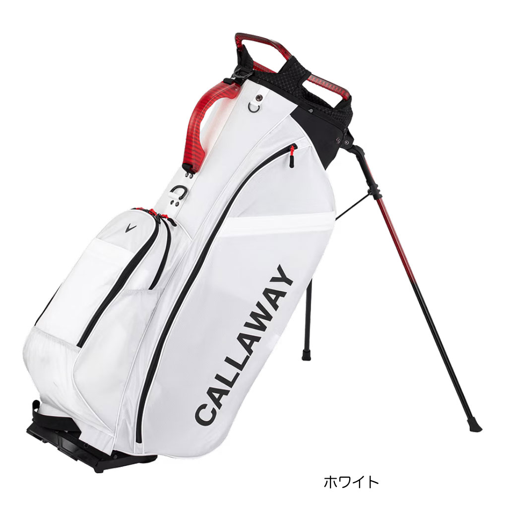 重さは2.4kgと軽量。口枠は9.0型を採用し、クラブの出し入れがしやすい5分割仕様。全体の印象はシンプルなデザインながら口枠とハンドルにクリアパーツを使用することでモダンな印象に。ポケットは合計4個。フロントポケットは2個。ダース箱が入る大きめポケットとスモールポケット。ファスナーポケットと連動したスナップポケットがあり、ファスナーを開けずにグッズへアクセス可能。右サイドは大容量のファスナーポケットとスナップポケット(独立型)。左サイドは、ミドルサイズのポケットを配置。軽量で強度があるナイロン素材を採用。