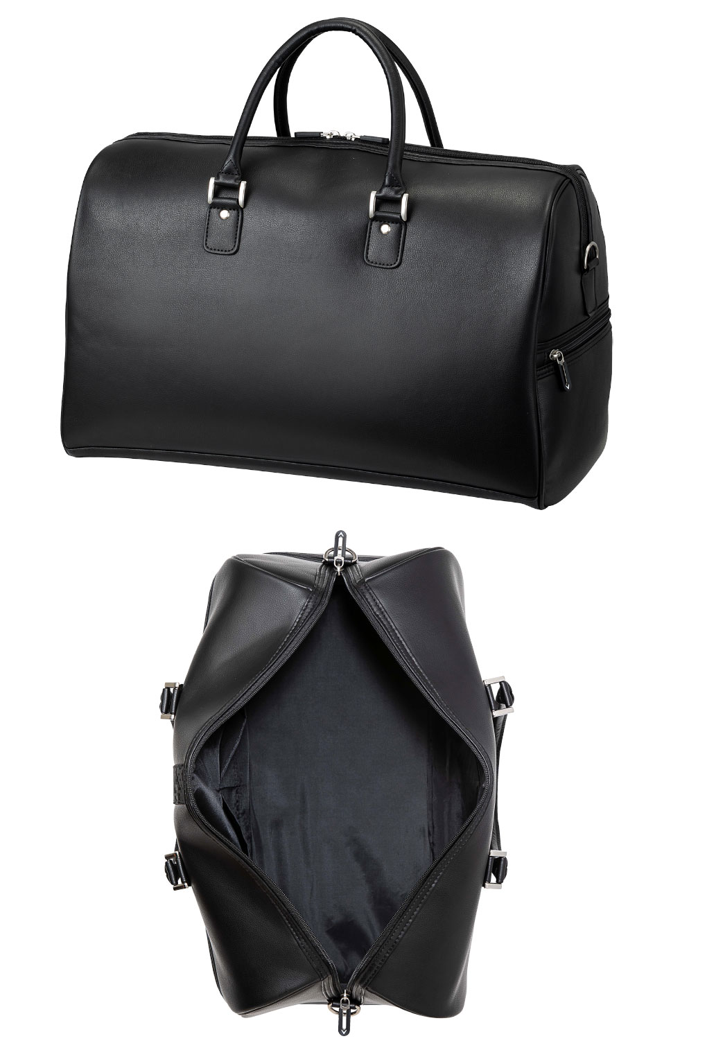 大容量のボストンバッグ。正面にファスナーポケットが2か所あり、収納に便利です。