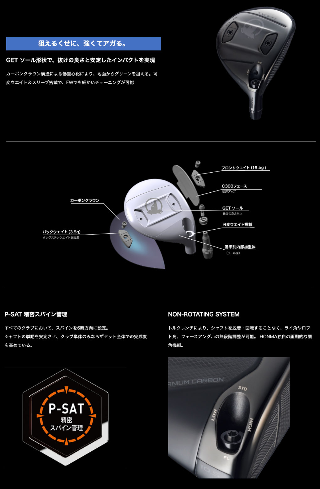| ヘッド素材/製法 | SUS630ボディ/ 鋳造+カーボンクラウン+タングステン+アルミ+C300変形フェース開口圧延 | |||