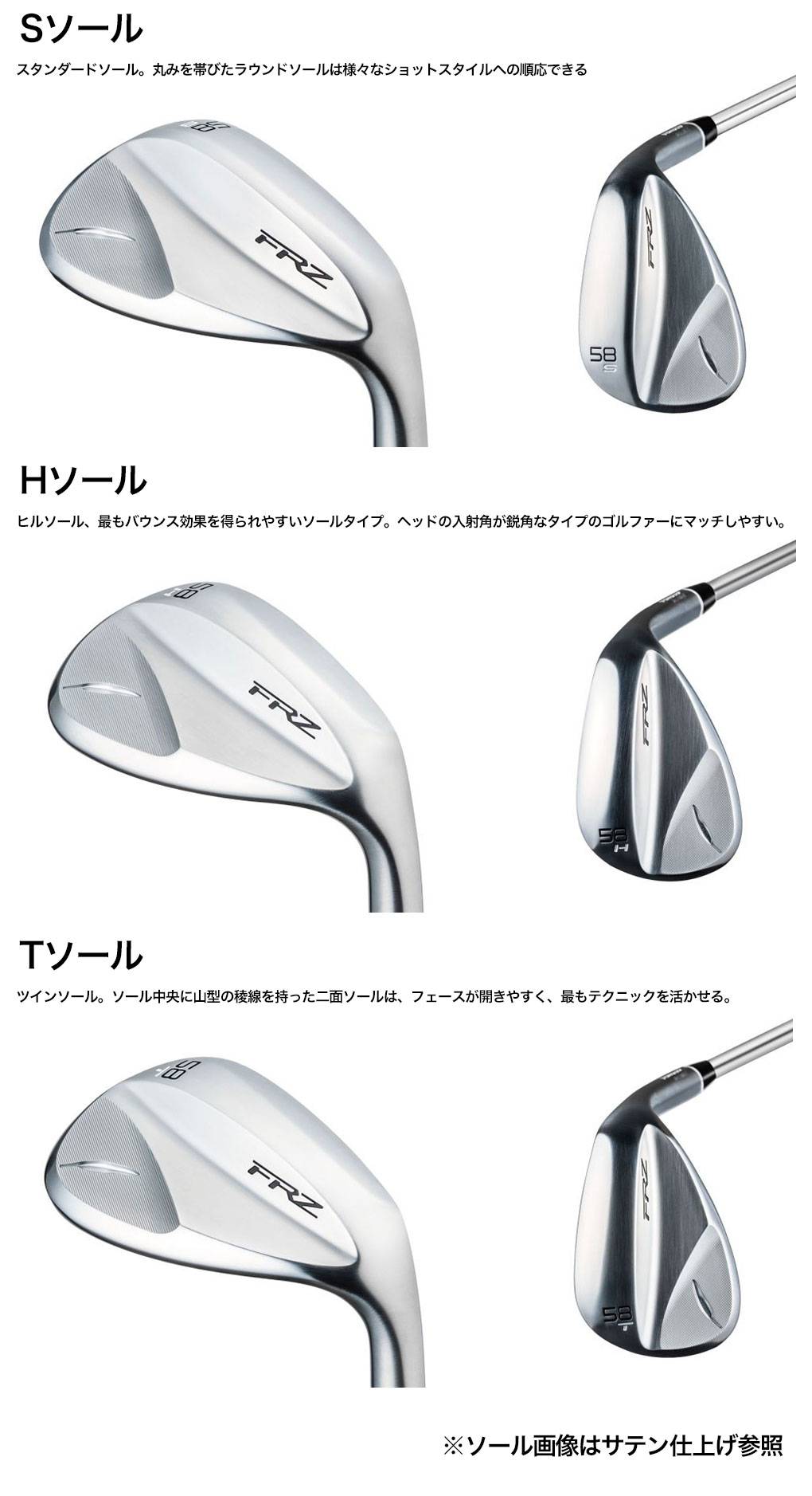 「MT-28」より22 年のスピンウェッジの変遷で培ってきた経験値から4種類のソールをラインナップ。ゴルファー一人ひとりがプレースタイル(フェースの開閉)やショットスタイル(ヘッドの入射角)に応じたベストなソールを選ぶことで、スピンパフォーマンスを最大化させることが可能です。