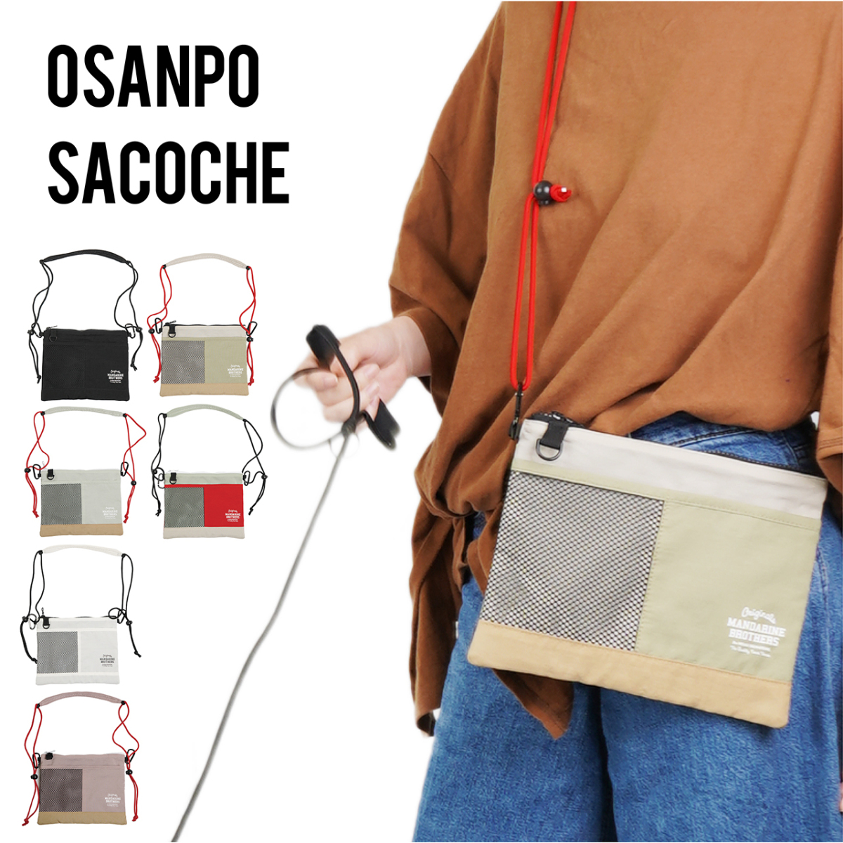 お散歩に必要なアイテムを収納。表と裏にポケットがが豊富で使いやすい。両手が空く便利なマンダリンブラザーズのお散歩サコッシュ。