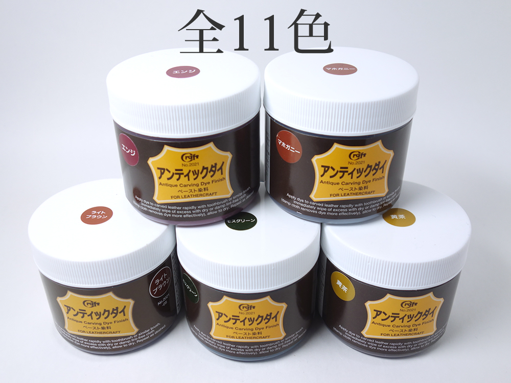 カービング・スタンピングした凹部分を彩色し、陰影を付け立体感をより強調する”アンティック仕上げ”に使用します。ワックスや樹脂を含んだ染着性の高いペースト染料です。