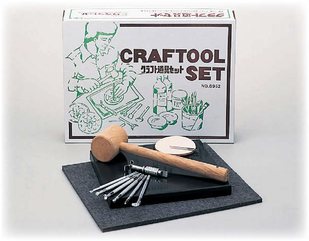 基本刻印6 本 (A104,B200,C431,P206,S705,V407)、スーベルカッター(S)、木槌( 並)、ゴム板( 中)、フェルト〔30 × 25cm〕、クラフトレース針〔3mm〕2 本、コースター 1 枚
