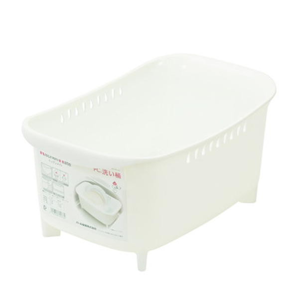 高足なので衛生的。取っ手付で持ちやすい。排水栓付、水切り穴付。