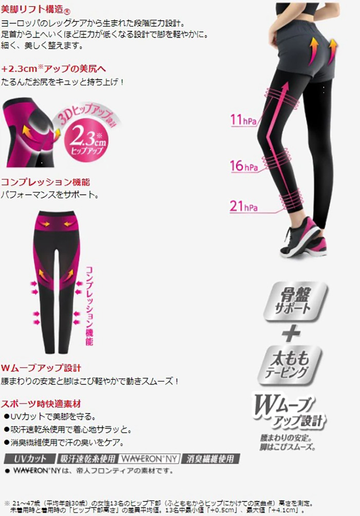 | 商品説明 | ・段階圧力設計(足首21hPa、ふくらはぎ16hPa、太もも11hPa、太ももの付け根9hPa) ・太もも部分にすき間をつくり、スッキリ細見せ美脚[内ももすき間設計] ・たるんだお尻を+3.3cm※キュッと持ち上げる[3Dヒップアップ設計] ・骨盤サポート+太ももテーピングで腰まわりが安定し、脚はこびがスムーズに[Wムーブアップ設計] ・スポーツ時快適素材使用(UVカット・吸汗速乾・ソフトな肌ざわり・ストレッチ素材・消臭繊維使用) ※未着用字と着用時のヒップ下部(太ももからヒップにかけての変曲点)高さを測定した差異平均値。 |