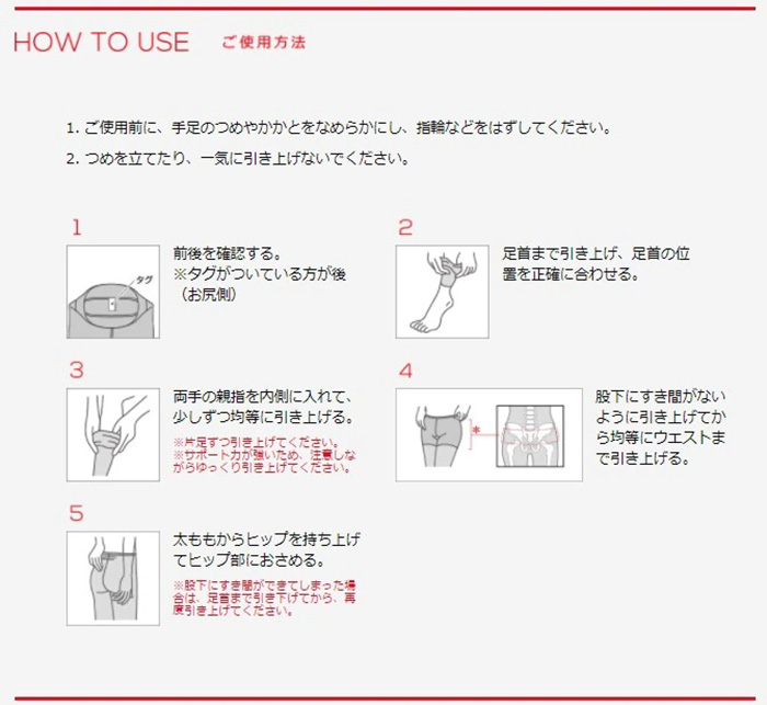 | 使用上の注意 | 1.次の方はご使用前に医師に相談する。 (1)現在、病気やけがなどによる脚のむくみやだるさを感じる方 (2)血圧の高い方、心臓・腎臓などに障害のある方 (3)現在、かゆみや発疹をおこしている方 (4)血行障害をおこしたことのある方 2.サイズの合わないものを使用しない。(血行が悪くなるおそれがあります。) 3.2枚重ねて使用しない。(血行が悪くなるおそれがあります。) 4.使用中、使用後に気分が悪くなったり、かゆみ、発疹、痛みなどの異常を感じた場合は、すぐに使用を中止する。 5.就寝時に使用しない。 6.医療目的に使用しない。 |