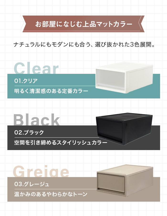 | 特徴 | 押入れやクローゼットにすっきり収納! 押入れ収納にオススメの奥行53cm・高さ22cmの1段引出し収納。 引出しの前面はすりガラス調で、中身が見える仕様です。 積み重ねてもずれない凹凸構造で、多段チェストとしても利用可能。 シンプルなつくりだからこそ、見出しやステッカー等を貼ってアレンジも自由自在なのが、嬉しいポイント。 ※ブラッククリアは販売終了致しました。 |