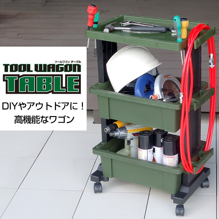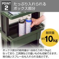 特徴 | ミリタリー調カラーがおしゃれな 便利な機能が満載のツールワゴン。 片側の側面は延長コードなどをかけられる ハンガー形状になっています。 ドライバー等が挿せる穴付き。 耐荷重は1段あたり約10kgなので、 重い工具などもたっぷり収納できます。 天板にちょい置きできるテーブルタイプ。 |