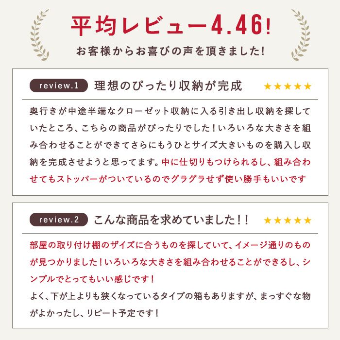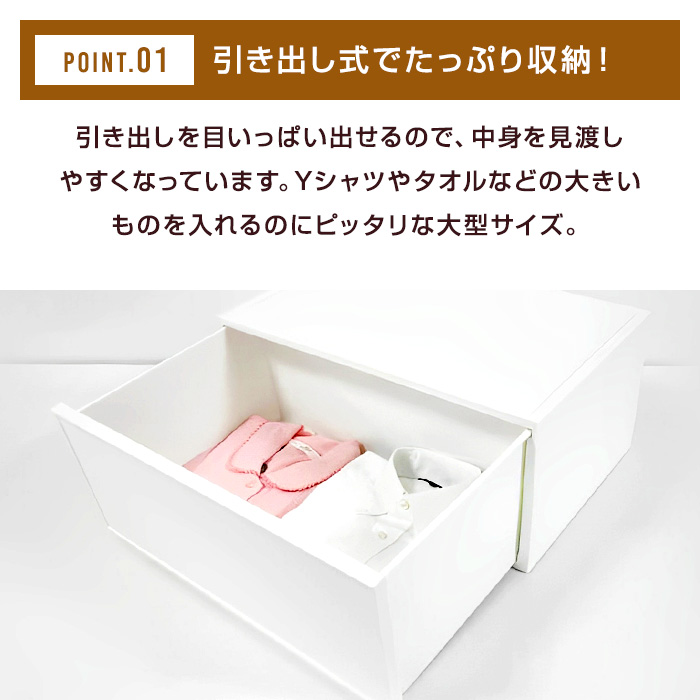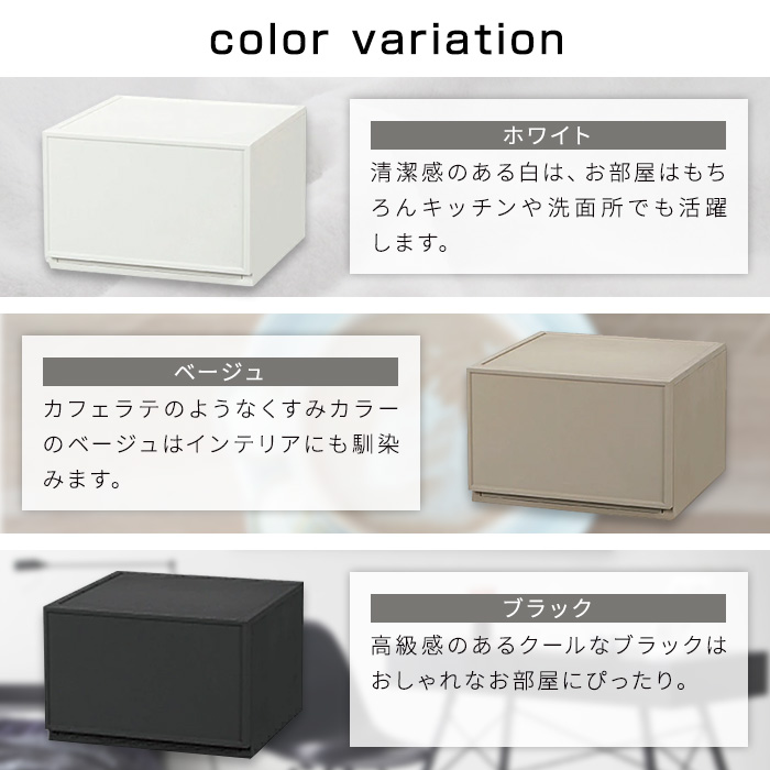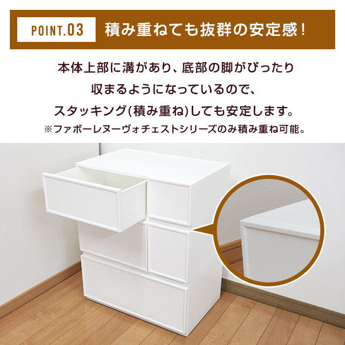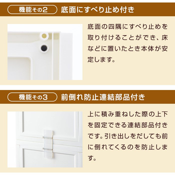 | 特徴 | サイズいろいろ!積み重ねして使えるシンプルなチェスト! 引き出しストッパー付きで安心。 |