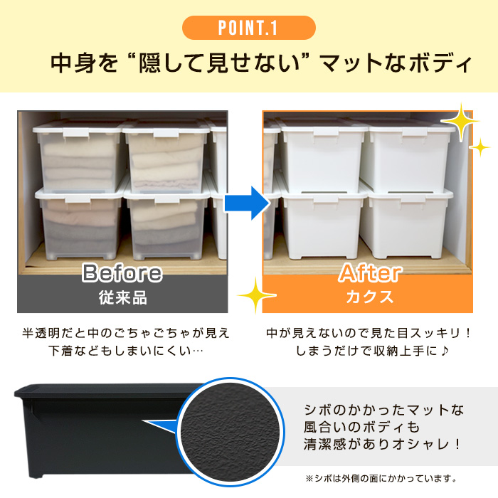 | 特徴 | シンプルを極めたインテリアボックスにモノトーンカラーでより美しくなったオールホワイト・オールブラックの限定仕様登場。 クローゼットを飛び出してリビングや寝室にさりげなく置けるシンプルなボックスになりました。 |