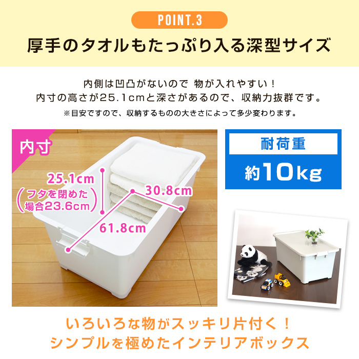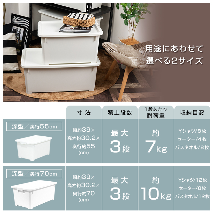 | 収納目安(1段あたり) | Yシャツなら 12枚 セーターなら 8枚 バスタオルなら 12枚 |