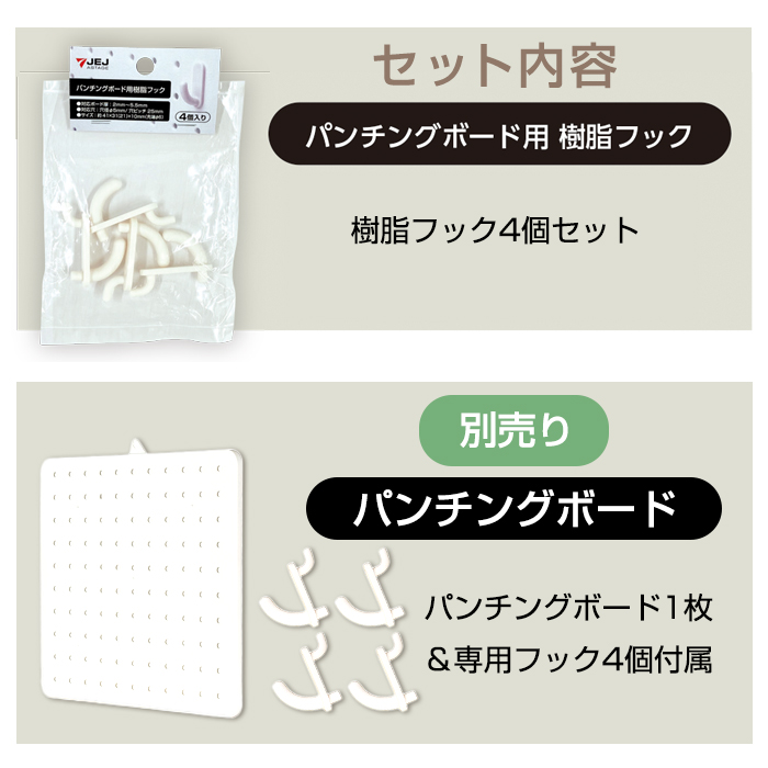 | 特徴 | リセスタイル パンチングボード専用樹脂フックです。 有孔ボードの穴にフックを差し込み、収納スペースをお好みにアレンジできます。 |