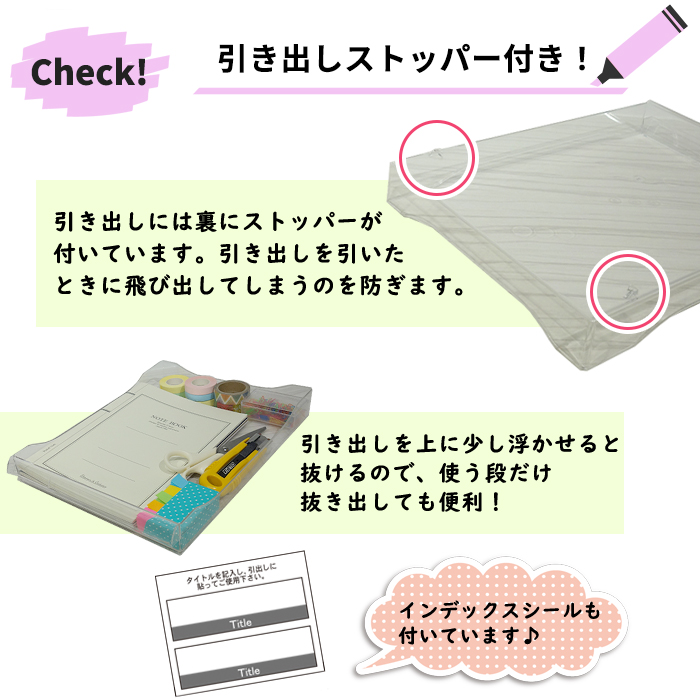 | 特徴 | A4サイズの書類や小物などをスッキリ収納。 引き出しは透明度に優れているので、中身がよく見えます。 |