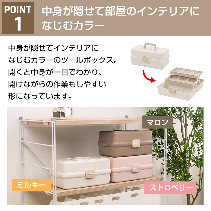 | 特徴 | 中身が隠せてインテリアに馴染むカラーのツールボックス。 仕切板が4枚付いていて収納物に合わせて自由に仕切れます。 薬箱や裁縫箱、文具やコスメなど小物を収納するのにピッタリ。 大人っぽさとかわいらしさの両方を併せ持つ、ミルキー・マロン・ストロベリーの3カラーからお選びいただけます。 |