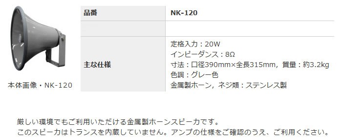 【P】【代引不可】ノボル電機トランス無し金属ホーンスピーカー NK-120 20W [NBR000066]