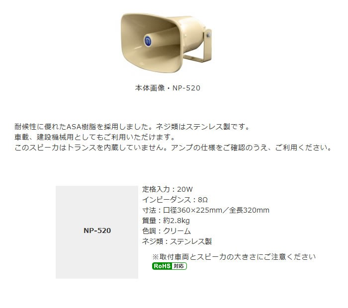 【P】【代引不可】ノボル電機車載用スピーカー トランス無し 樹脂製ホーンスピーカー NP-520 [NBR000078]