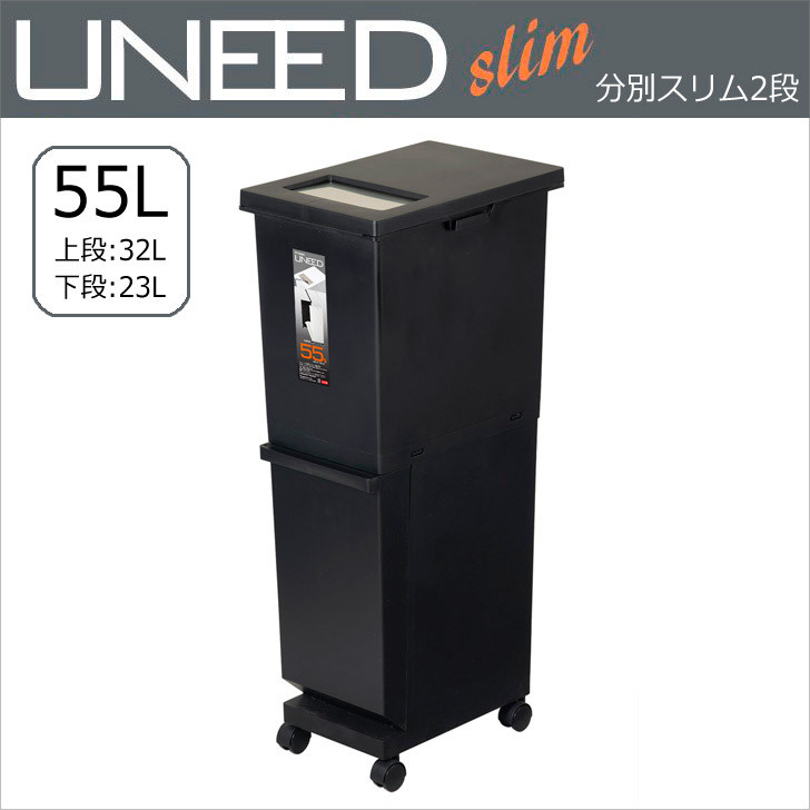 ゴミ箱 新輝合成 ユニード 分別スリム2段 55S ブラック ダストボックス キャスター付 縦型 55L 32L+23L 隙間 おしゃれ UNEED ごみ箱 送料無料