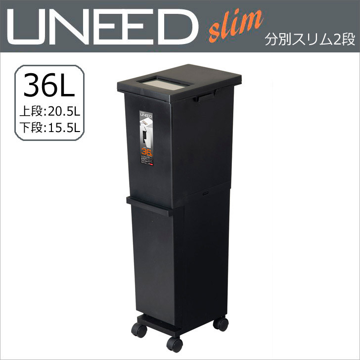 ゴミ箱 新輝合成 ユニード 分別スリム2段 36S ブラック ダストボックス キャスター付 縦型 36L 20.5+15.5L 隙間 送料無料