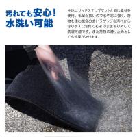 生地はサイドステップマットと同じ素材を使用。毛足が長いので水や泥に強く、荷物を積む機会の多いラゲッジを汚れから守ります。 汚れてもそのまま取り外して洗濯可能です。また荷物の滑り止めとしても効果があります。