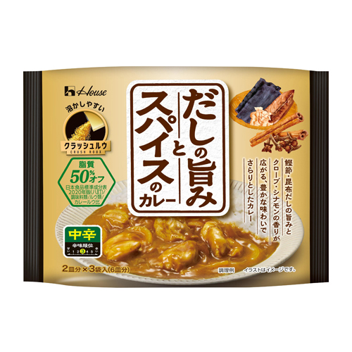 だしの旨みとコーンスターチ由来のとろみを基調とし、油脂の配合割合を工夫した、小分けで溶かしやすいクラッシュルウなので、脂質が50%オフ※で重たさが低減されており、だしの旨み×スパイスという新しいおいしさがあるカレーを、適量作ることができます。(※日本食品標準成分表2020年版(八訂)/調味料類/ルウ類/カレールウ比)